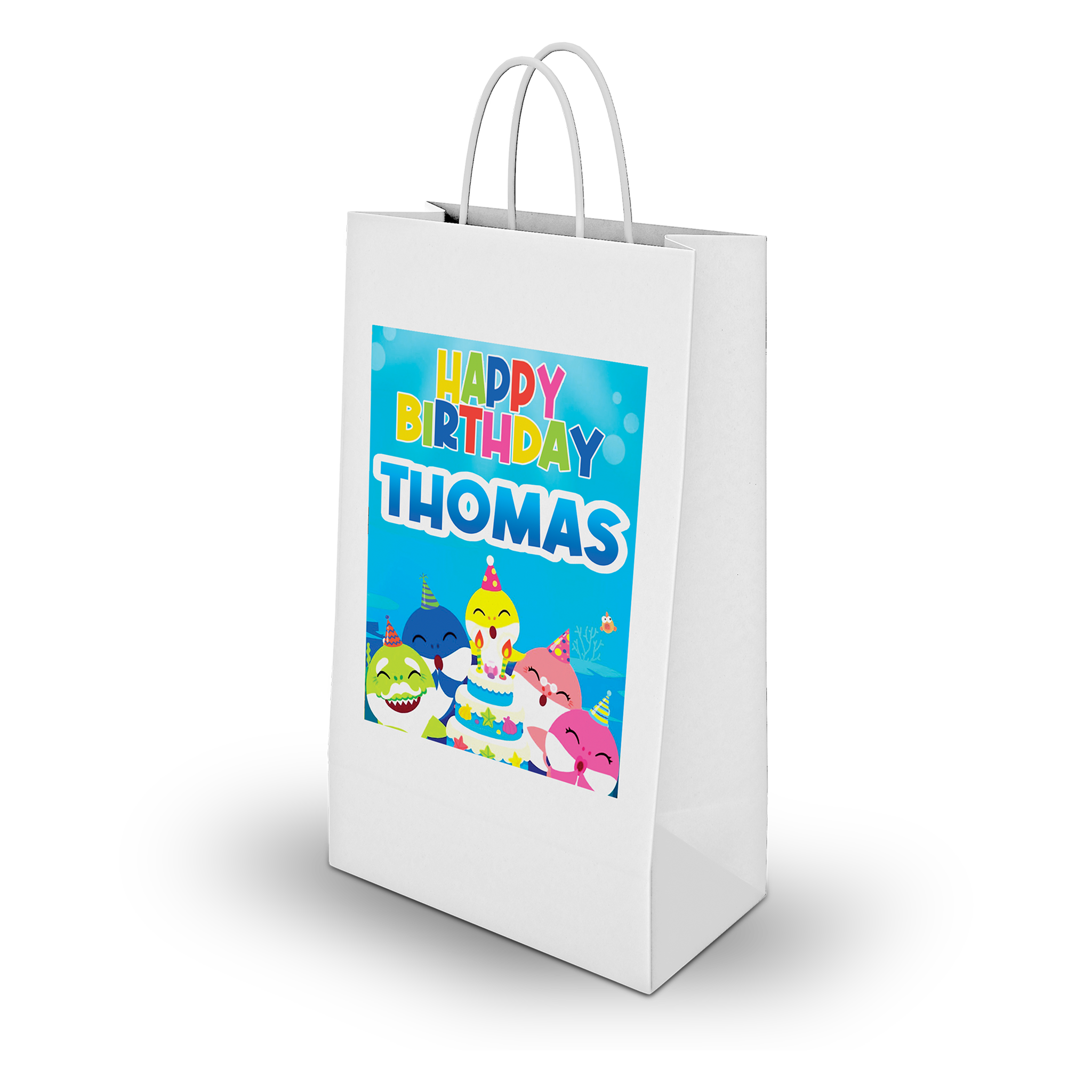 De leukste en lekkerste traktatie deel je uit in een 100% gepersonaliseerde party bag (uitdeel tasje) van Baby Shark.